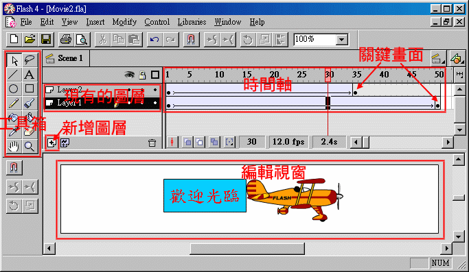 Flash動畫具備了五樣重要的元素,那就是:劇本、場景(Scene)、圖層(Layer)、畫格(Frame)、角色(Symbol),當然更少不了你這位導演了。