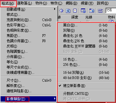 [影像類型]可以用來改變目前影像最大顏色數量。