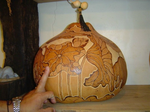 素雕法分成陽刻和陰刻 陽刻---雕刻線虛線是陽刻,鏤空葫蘆型體線而成。 陰刻---先在葫蘆上作畫,然後運用淺刻法加以完成。