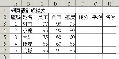 重點:1.輸入資料,2.總分=sum(c3:e3),3.平均=average(c3:e3),4.選平均按遞減排序,5.輸入名次,6.選座號按遞增排序