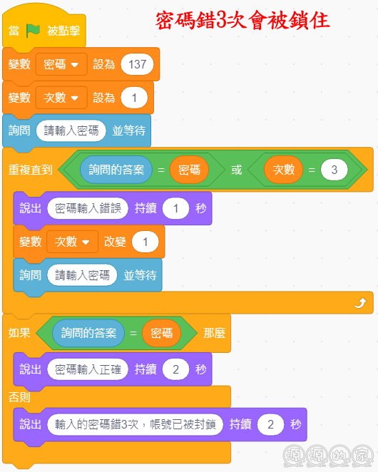 ●作業6:請完成207頁[輸入密碼錯3次會被鎖住]的Scratch作品,請在2~3週內傳到第6次作業,說明如下: 老師介紹:Scratch網頁版與安裝版的差別、Scratch版面、舞台>角色>程式積木>造型>音效、程式作品檔案【下載到您的電腦】。 基本題:使用預設的貓咪角色,密碼變數設為自己的學號,重複詢問密碼直到密碼正確或問了3次,最後顯示密碼正確或錯誤封鎖。 進階題:1.密碼放自已學號,2.角色造型自由發揮,3.密碼輸入錯誤顯示自創的"錯誤"造型,4.顯示還有幾次機會,5.輸入正確顯示"正確"的造型。 提示:可自由調整程式,可自創或選其它造型詢問密碼或顯示密碼正確與否,可用字串組合積木顯示警示文字及剩餘次數。 重點提醒:1.【密碼錯3次會被鎖住】程式要測試正確且密碼要設學號,2.沒用到的積木要刪除不要亂放, 成績計算方式:基本題正確且有改文字得80分,密碼沒設學號扣5分,大致都相同扣2分,進階題:每次換造型、封鎖換造型、剩幾次、其它,各加5分*4=20