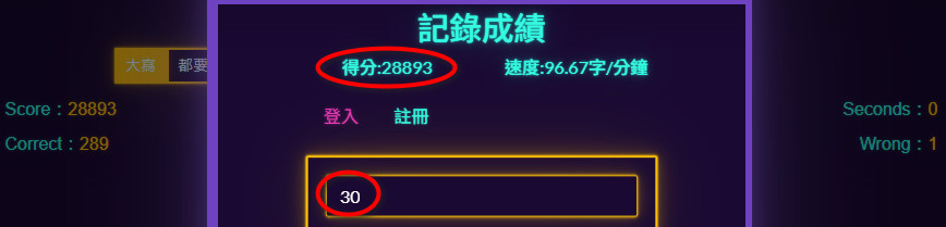 下次測驗:英文字母打字基本功:上方選【大寫】或【小寫】,預設【隨機出現】,下方按【START】開始,三分鐘隨機至少2萬分。