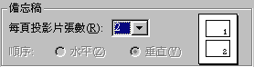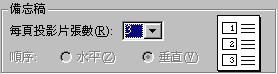 3.如果選"投影片"將會在每張報表印一張投影片,如果選"講義"可在右側選每張報表的印製格式,說明如下: