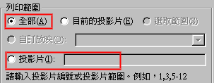 1.指定列印範圍:在[列印]交談視窗中建議不要將列印範圍選[全部],應選[投影片]輸入列印範圍1-2或1-4,等列印無誤後再將剩餘的印完,以免印壞了浪費墨水和紙張。