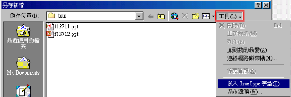 為了使簡報作品能在任何電腦正常顯示使用到的字型,可以在存檔對話視窗中選取右上角的[工具]\[嵌入TrueType字型]再進行存檔動作。執行此功能將會使檔案變的很大,如果不希望檔案變大,建議您使用明體與標楷體的字型就好了,其它字型就放棄不要用吧!