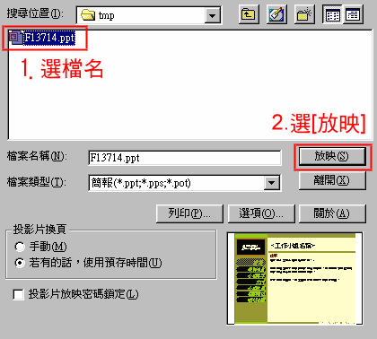 備註:如果產生隨身簡報的過程中有包含PowerPoint撥放機則安裝隨身簡報到硬碟中所產生的撥放機名稱為PPVIEW32.EXE,執行此撥放機後的操作畫面如下圖所示: