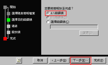 4.您要將簡報放至何處?勾選[A:\磁碟機],按[下一步]。