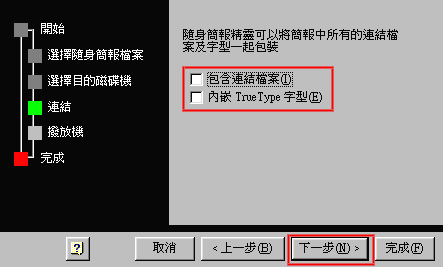 5.依個人需求勾選連結檔案及內嵌TrueType字型,按[下一步]。
