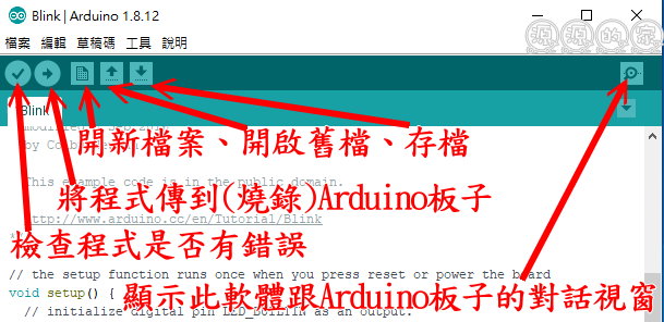 在Arduino IDE軟體中提供很多範例程式,請依下圖操作流程開啟控制LED閃爍的程式,再將Arduino板子用USB連接線接好,在Arduino IDE軟體按右箭頭(如上圖),就可以將寫好的程式傳到Arduino板子執行了。