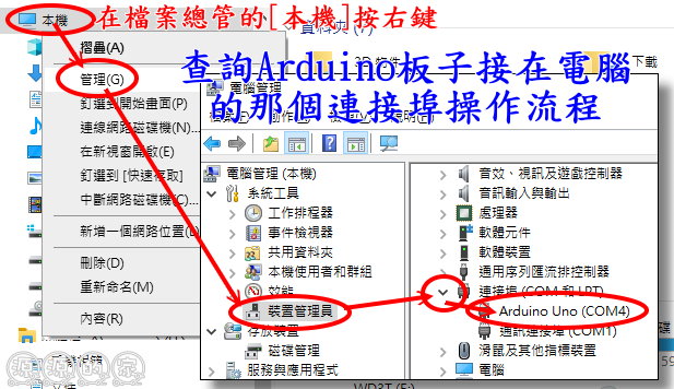 在Arduino IDE軟體要先設定使用的Arduino板子種類及連接的序列埠編號。
