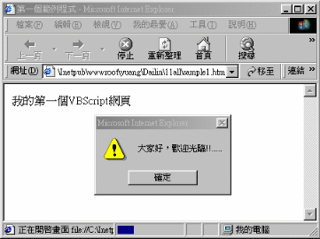 | <html> <head> <title>第一個範例程式</title> </head> <body> <script language="vbscript"> alert "大家好,歡迎光臨!!....." </script> </body> </html> |